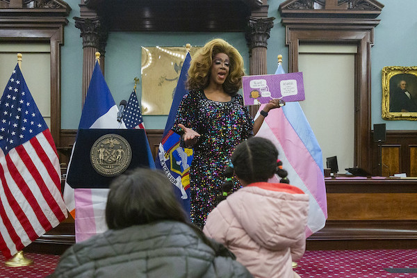Near the end of the evening, drag performer Harmonica Sunbeam took the stage for a Drag Queen Story Hour performance of Say Something! by Peter H. Reynolds. Several moms in the Council Chamber brought their kids up front for what was a very sweet and tame performance, by drag standards. There are videos online of Drag Story Hour shows which are little more than burlesque performances with kids in the audience, and it isn’t hard to see why conservatives object to those. But at City Hall, Harmonica was fully-clothed throughout, and read aloud from a cute children’s book about the ways kids can express themselves creatively.