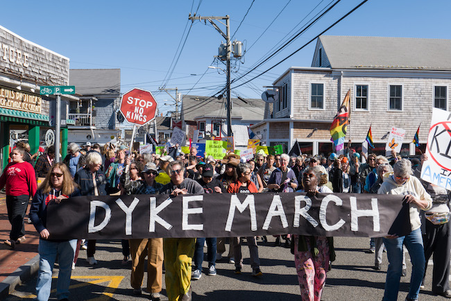 In Provincetown, the long-planned Dyke March was the day’s first expression of power. Their always present drummers, followed by locals and Women’s Week 2025 celebrants, formed the small but mighty group of over 500 who marched from Womencrafts on Commercial Street to Bas Relief Park at the base of Pilgrim Monument.