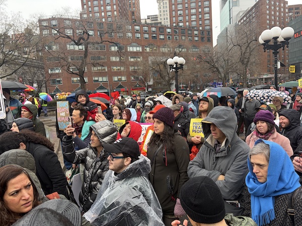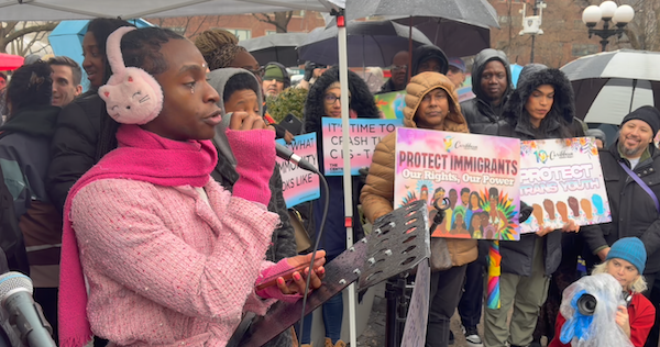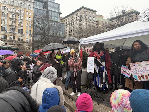 BY CHARLI BATTERSBY | January 10 was a lousy day for a Trans rights rally at Union Square–a rainy Saturday afternoon that was just warm enough to keep the drops from freezing. Nonetheless, the small crowd for the Together We Win: NYC Rally for Trans Kids grew steadily over the course of its two hours–from less than 100 early arrivals to several hundreds at its high point. Electeds and activists gathered under a tiny tent to speak about the upcoming Supreme Court cases about transgender athletes, while dedicated allies and curious passersby listened in the rain.