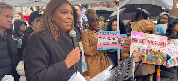 NY State Attorney General Letitia James was one of speakers. She congratulated the crowd for enduring the rain, then said, “Right now, across our country, we are seeing a coordinated effort to erase transgender young people from their classrooms, their sports teams, and their doctors’ offices, but New York will not be complicit. I will always fight to make sure every child in New York—every child in this country—can grow up safe, supported, and proud of who they are.”