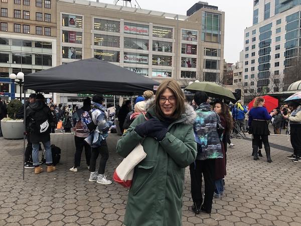 She was just as dedicated to her side of the discussion as the pro-trans speakers, arguably even more dedicated than the ones who skipped out after making their speeches. The protester (counterprotester?) agreed to a picture and a quick interview. We asked her how she’d been received by the crowd. She told us that she had kept her sign hidden at first, but people turned hostile when she unfurled it. Few people seemed willing to speak to her after that. Our reporter’s pink coat, blue scarf, and butterfly pin made it subtly clear which side of the debate we were on. But the counterprotester was polite and honest. She articulated her views with as much clarity and earnestness as anyone else at the rally. And she had stuck it out in the rain, right to the end, hoping someone would listen.