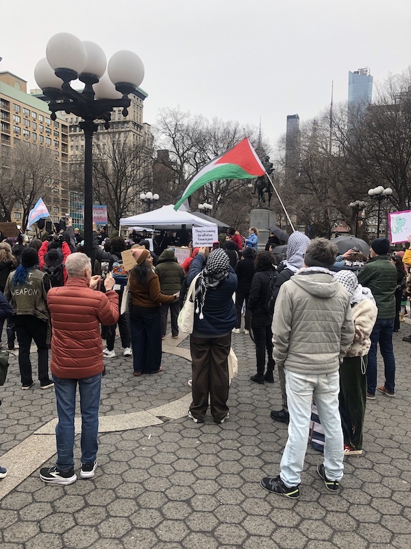 Other protest groups were milling around Union Square, getting their flags mixed in with the trans activists. One gathering of Palestine supporters were there earlier in the day, but had moved to the southern side of 14th Street when the LGBTQ group began setting up. Later, a Free Palestine activist wandered through the trans crowd; the six-foot long black and red flag slicing like a shark’s dorsal fin through the pink and blue trans flags.