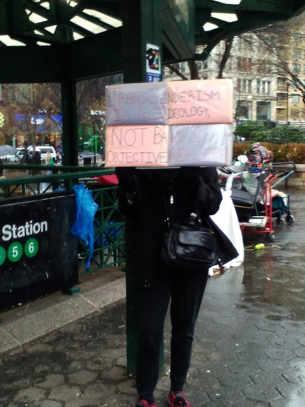 After the trans activists were gone, another group of Palestine supporters began setting up. They had waited patiently in the rain for two hours so that they could have their turn on the photogenic stairs at the southern tip of the Union Square. This reporter noticed one final person with a transgender sign. This one read, “Transgenderism is an ideology, not based in objective reality.”