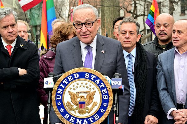 FOLD THE FLAG INTO FEDERAL PROTECTION? | During a February 15 announcement taking place in visual range of the restored flag, Senator Charles Schumer previewed legislation that would see Congress codify the Pride flag in federal law. “This bill,” says Schumer, “bypasses political interference, and ensures no administration can ever lay a finger on it again. The Pride flag belongs at Stonewall and we will work to make that protection permanent.”