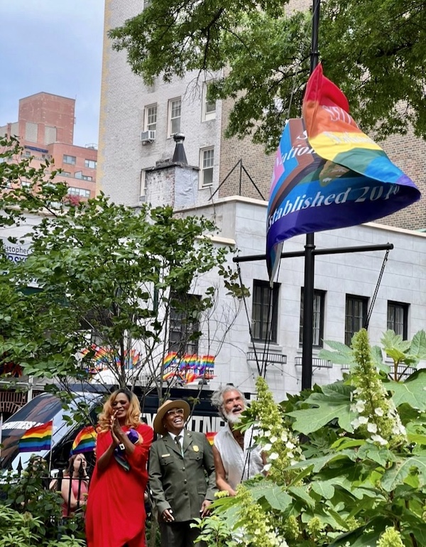 June 1, 2022 marked the official, ceremonial installation of a Rainbow flag with the National parks logo (“after I was previously getting monthly permits to have it there,” notes Menendez). L to R: Miss Simone, former NPS Manhattan Sites Superintendent Shirley McKinney, & Steven Menendez. | Photo courtesy of Menendez